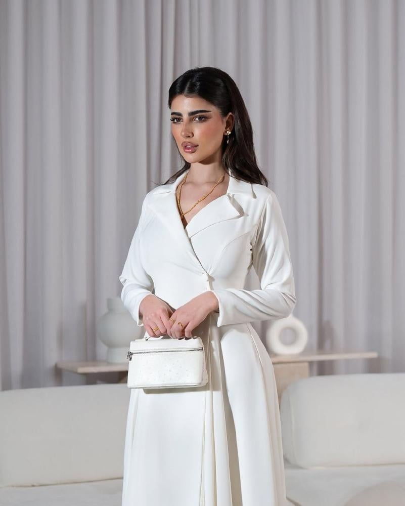 فستان طويل باللون الأبيض بتصميم رسمي وأنيق، يتميز بياقة مفتوحة وأكمام طويلة، مناسب للمناسبات الرسمية والخاصة.